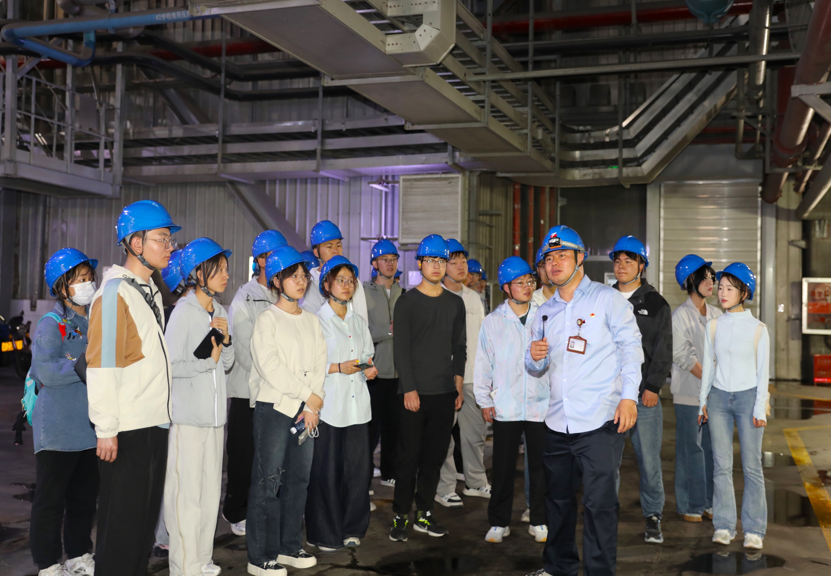 在公司工程师的全程引导下,同学们深入生产一线,近距离观摩锅炉、汽轮机、发电机等核心设备的运行实况。工程师详细介绍了电厂运行概况、发电原理及关键电气设备,系统展示了从燃料输送、能量转换到电力并网的全过程。同学们结合课堂所学知识,就设备运行、技术细节等问题积极与工程师进行交流探讨。通过此次沉浸式学习,同学们加深了对专业知识的理解,对电力生产有了更直观的认识,也为未来职业发展奠定了坚实基础。